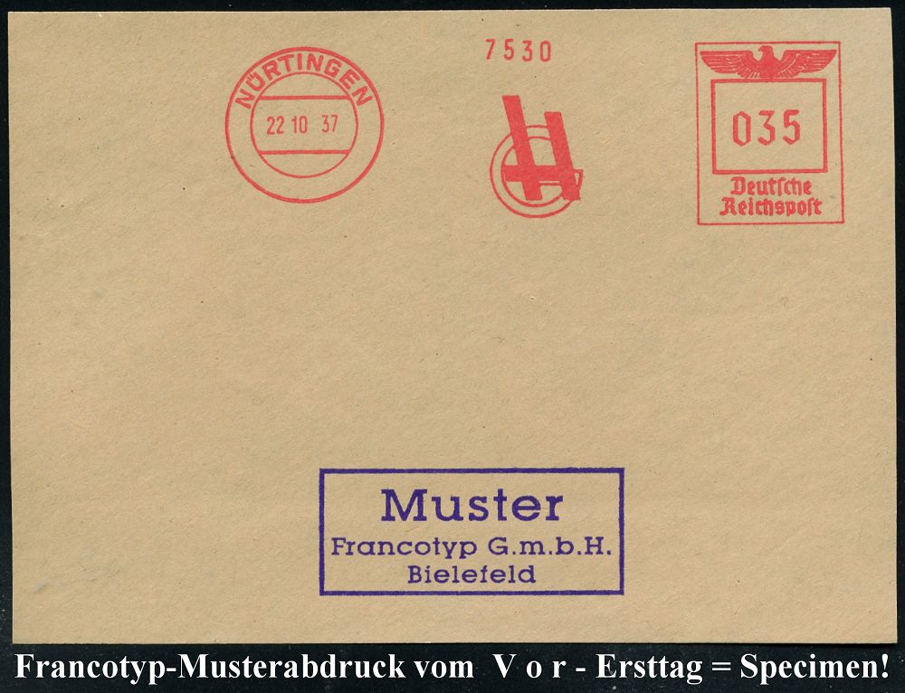 4713 | 35 € | POSTLEITRAUM 7400 (OHNE REUTLINGEN u. TÜBINGEN) : NÜRTINGEN/ H G 1937 (22.10.) AFS-Musterabdruck Francotyp "Reichsadler" (Monogr.-Logo) = Maschinenfabrik Gebr. Heller, glasklar gest. Francotyp-Musterblatt vom V o r - Ersttag! (mit Attest), selten!, vergl. Kat.-Nr. 4716 (Dü.E-5CGh) | ![]() ![]() | |