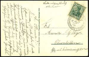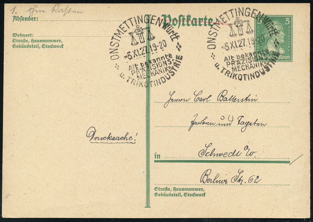 4724 | 16 € | POSTLEITRAUM 7400 (OHNE REUTLINGEN u. TÜBINGEN) : ONSTMETTINGEN Württ/ .PRÄZISIONS-/ MECHANIK/ u.TRIKOTINDUSTRIE 1927 (5.XI.) HWSt ohne Datumsrahmen = Type I (Waage) ab 1927 verwende 2x auf Inl.-Kartet, (Bo.1/Ty.I = Erstjahr.) | ![]() | |