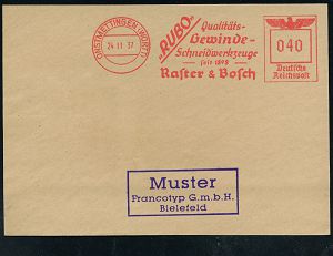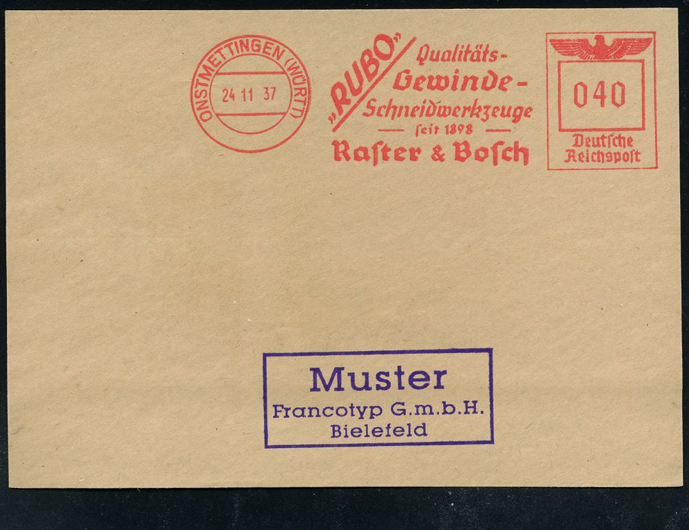 4727 | 35 € | POSTLEITRAUM 7400 (OHNE REUTLINGEN u. TÜBINGEN) : ONSTMETTINGEN (WÜRTT)/ "RUBO"/ Qualitäts-/ Gewinde-/ Schneidewerkzeuge../ Raster & Bosch 1937 (24.11.) AFS-Musterabdruck Francotyp "Reichsadler" , glasklar gest. Francotyp-Musterblatt vom V o r - Ersttag! (mit Attest), selten! (Dü.E-5CGo) | ![]() ![]() | |