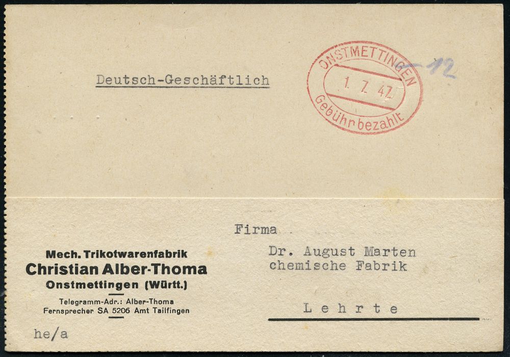 4728 | 15 € | POSTLEITRAUM 7400 (OHNE REUTLINGEN u. TÜBINGEN) : ONSTMETTINGEN/ Gebühr bezahlt 1947 (1.7.) Doppeloval-PFS ohne Wertangabe u. Uhrzeit = 12 Pf. , klar gest. Firmen-Kt.: Mech. Trikotwarenfabrik, Christian Alber-Thoma.. (Dü.A-5, Nr.20) | ![]() | |