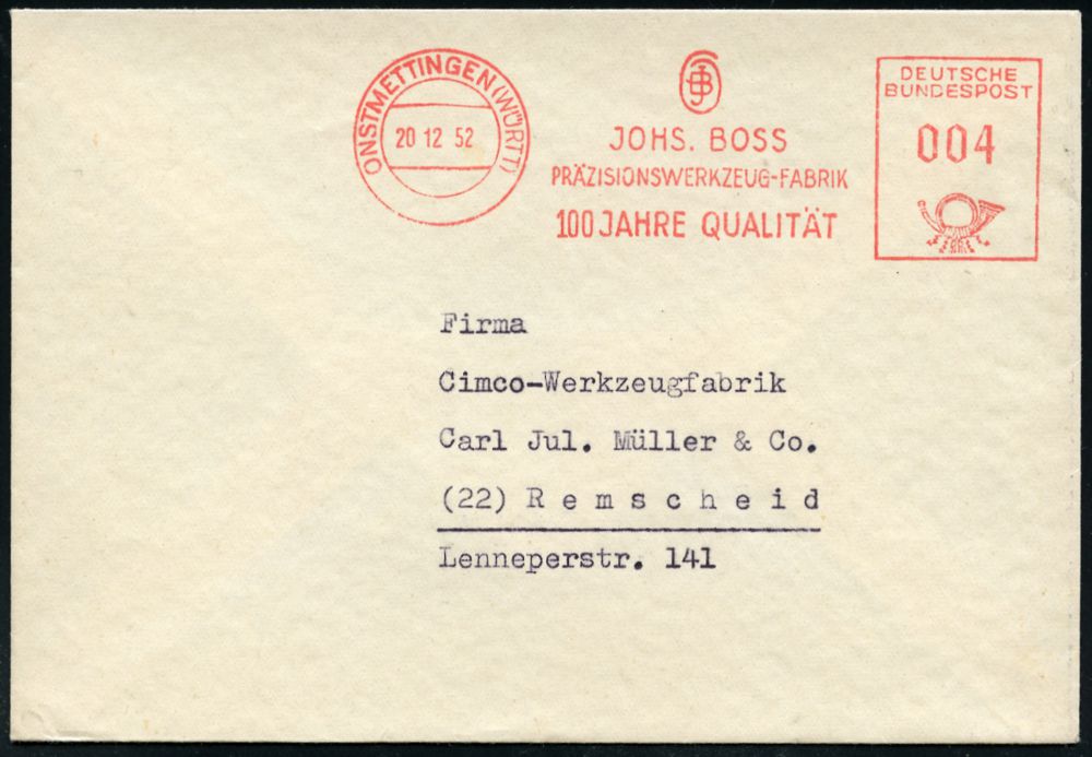 4729 | 14 € | POSTLEITRAUM 7400 (OHNE REUTLINGEN u. TÜBINGEN) : ONSTMETTINGEN (WÜRTT)/ JOHS.BOSS/ PRÄZISIONSWERKZEUGFABRIK/ 100 JAHRE.. 1952 (20.12.) AFS Francotyp "Posthorn" , klar gest. Inl.-Bf. (Dü.E-23CG) | ![]() | |