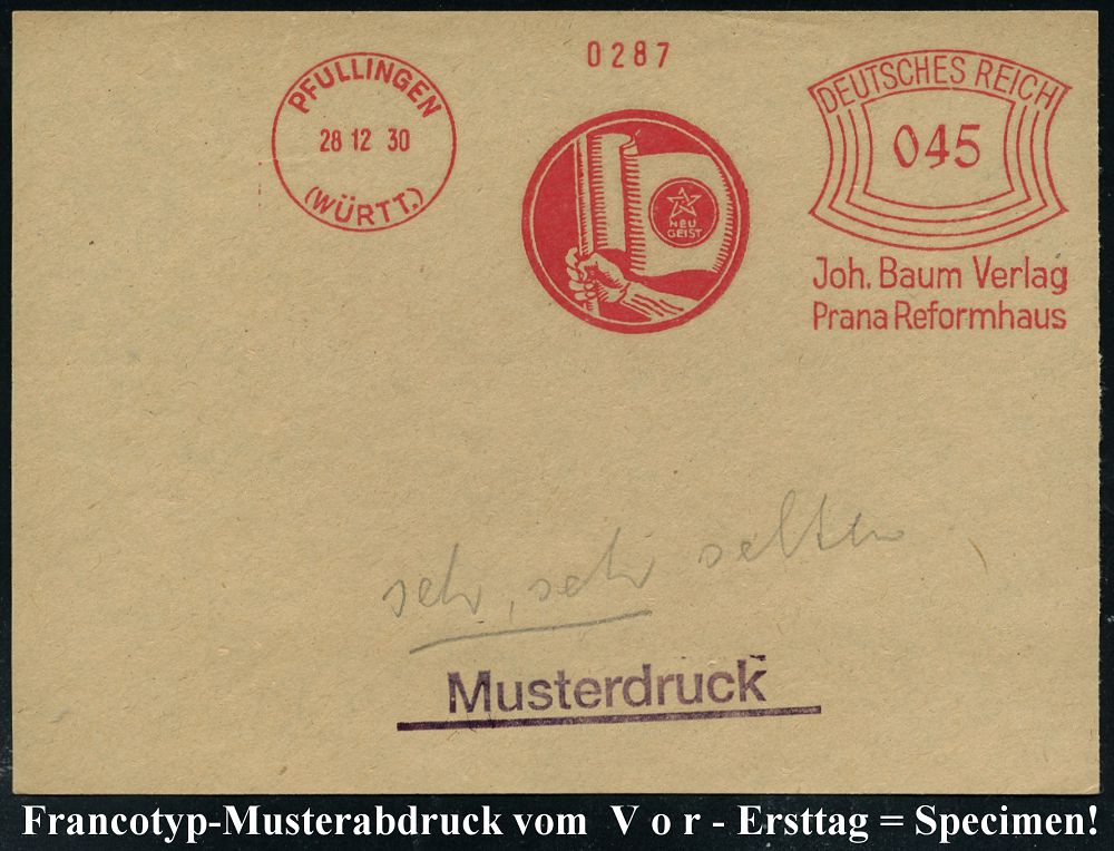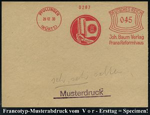 4734 | 45 € | POSTLEITRAUM 7400 (OHNE REUTLINGEN u. TÜBINGEN) : PFULLINGEN/ (WÜRTT.)/ Joh.Baum Verlag/ Prana Reformhaus 1930 (28.12.) sehr seltener AFS-Musterabdruck Francotyp "Bogenrechteck" (Logo: Hand mit Flagge) glasklar gest. Francotyp-Musterblatt vom V o r - Ersttag! (mit Attest) lt. Glasewald u. Dürst sehr selten! (Dü.E-1CEh) | ![]() ![]() | |