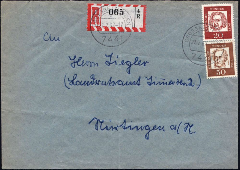 4644 | 20 € | POSTLEITRAUM 7400 (OHNE REUTLINGEN u. TÜBINGEN) : 7441 GROSSBETTLINGEN/ a 1962 (27.7.) 1K-Segment auf 20 Pf. Bach u. 50 Pf. Goethe + provis. RZ = Blanco-RZ mit Tagesstempel! , Fern-R-Bf. R-Bf. (Mi.352, 356) | ![]() | |