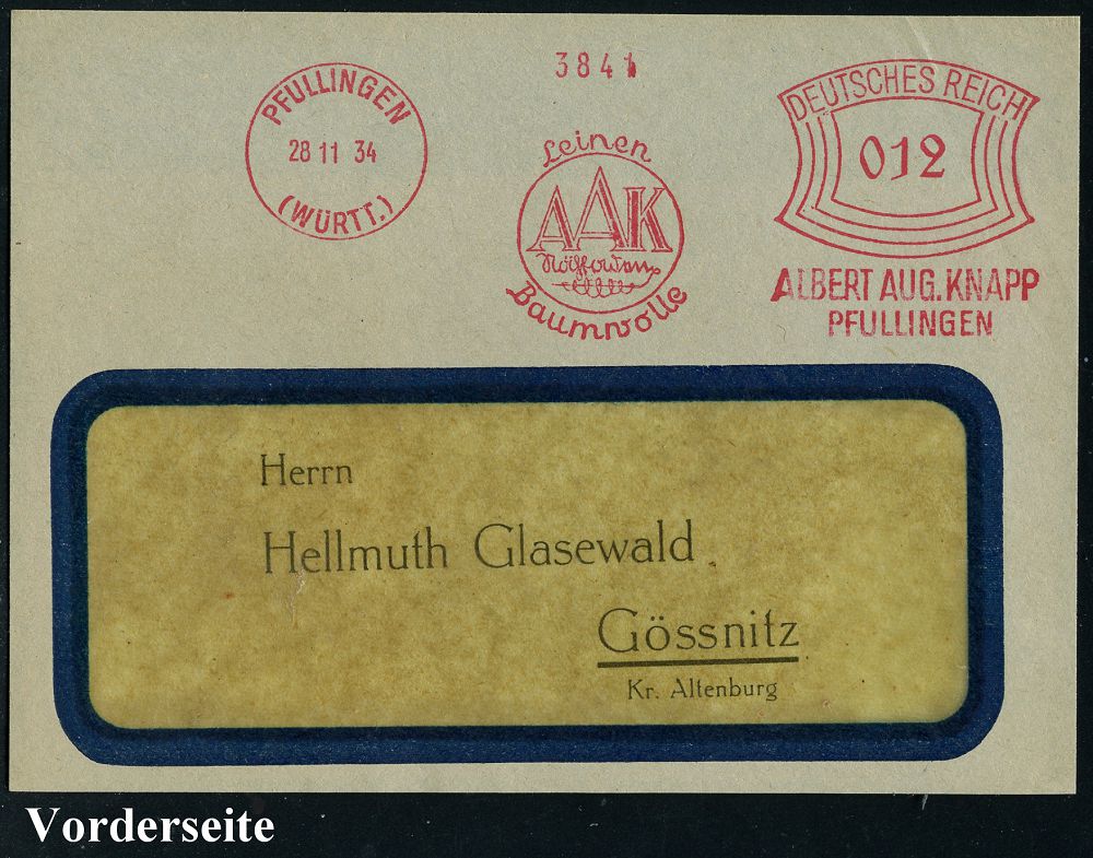 4735 | 14 € | POSTLEITRAUM 7400 (OHNE REUTLINGEN u. TÜBINGEN) : PFULLINGEN/ (WÜRTT.)/ AAK/ Leinen/ Baumwolle/ ALBERT AUG.KNAPP.. 1934 (28.11.) AFS Francotyp "Bogenrechteck" (Monogr.-Logo) kleine Vorderseite (Dü.E-1CEh) | ![]() | |