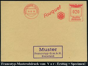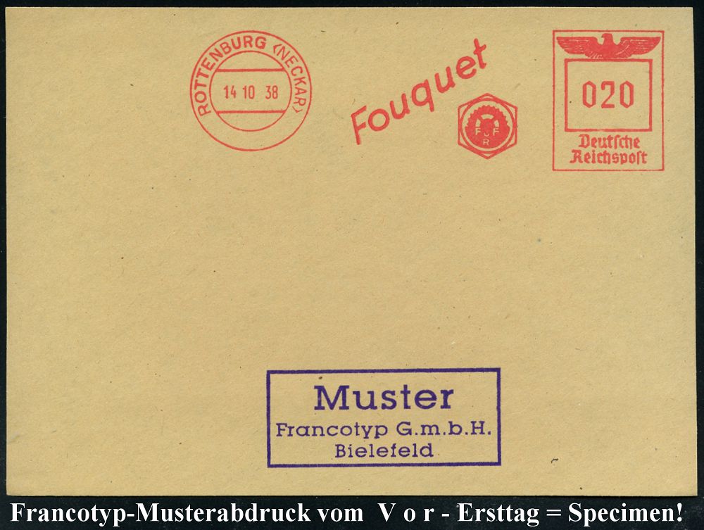 4785 | 35 € | POSTLEITRAUM 7400 (OHNE REUTLINGEN u. TÜBINGEN) : ROTTENBURG (NECKAR)/ Fouquet 1938 (14.10.) AFS-Musterabdruck Francotyp "Reichsadler" (Firmen-Logo) glasklar gest. Francotyp-Musterblatt vom V o r - Ersttag ! (mit Attest), selten! (Dü.E-5CGo) | ![]() ![]() | |
