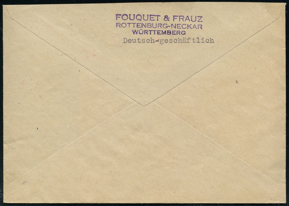 4787 | 35 € | POSTLEITRAUM 7400 (OHNE REUTLINGEN u. TÜBINGEN) : ROTTENBURG (NECKAR)/ Fouquet 1945 (18.10.) aptierter AFS Francotyp "Reichsadler" u n v e r ä n d e r t weiterverwendet = Notmaßnahme! (zeitbedingt teils etw. abnenutzt) rs. Abs..: FOUQUET & FRAUZ.., seltener Fern-Bf. (Dü.E-5CG, unverändert !) | ![]() ![]() | |