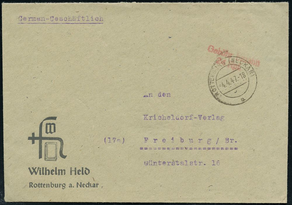 4788 | 12 € | POSTLEITRAUM 7400 (OHNE REUTLINGEN u. TÜBINGEN) : ROTTENBURG (NECKAR)/ a 1947 (4.4.) 2K-Steg + roter 2L: Gebühr bezahlt/ 24 RPf. , Firmen-Bf.: Wilhelm Held.. | ![]() | |
