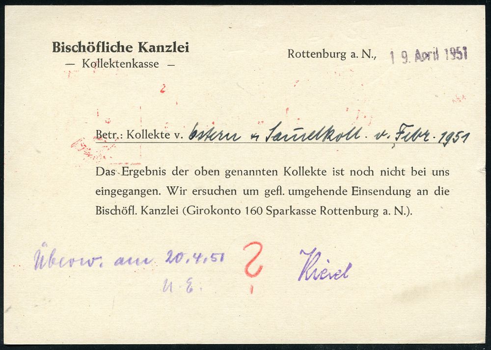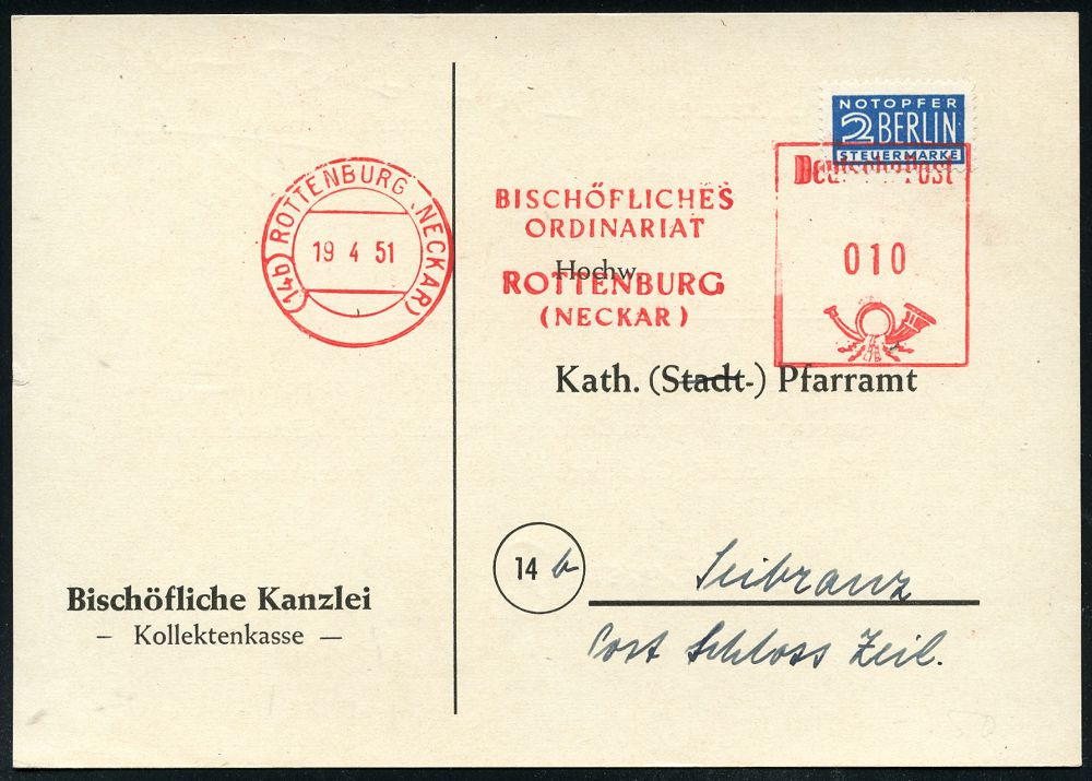 4789 | 16 € | POSTLEITRAUM 7400 (OHNE REUTLINGEN u. TÜBINGEN) : (14b) ROTTENBURG (NECKAR)/ BISCHÖFLICHES/ ORDINARIAT.. 1951 (19.4.) AFS Postalia "Posthorn" auf 2 Pf. NoB (= Vorausentwertung) Kirchen-Dienst-Kt.: Bischöfl. Kanzlei.. Anmahnung einer Kollekte! (Dü.E-20 B) | ![]() ![]() | |