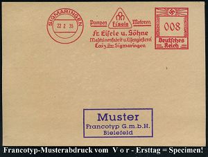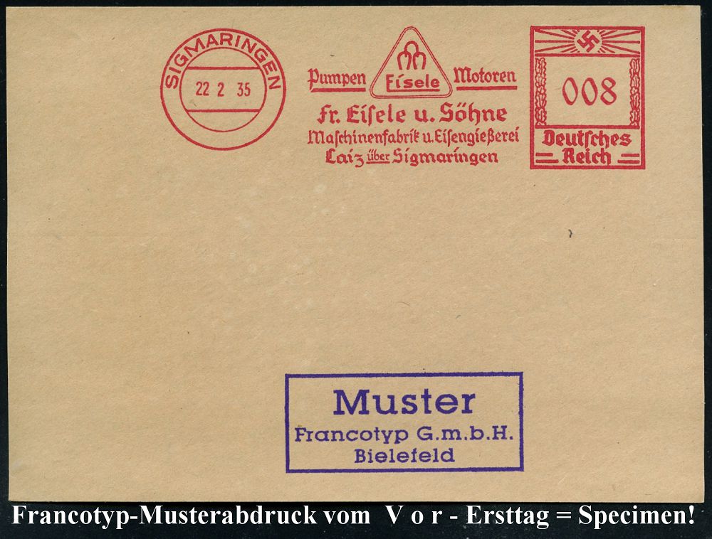 4792 | 35 € | POSTLEITRAUM 7400 (OHNE REUTLINGEN u. TÜBINGEN) : SIGMARINGEN/ Pumpen/ Eisele/ Motoren/ Fr.Eisele u.Söhne/ ..Eisengießerei/ Laiz.. 1935 (22.2.) AFS-Musterabdruck Francotyp "Hakenkreuz" (Firmen-Logo) glasklar gest. Francotyp-Musterblatt vom V o r - Ersttag ! (mit Attest), selten!, vergl. Kat.-Nr. 4793 (Dü.E-3CEo) | ![]() ![]() | |