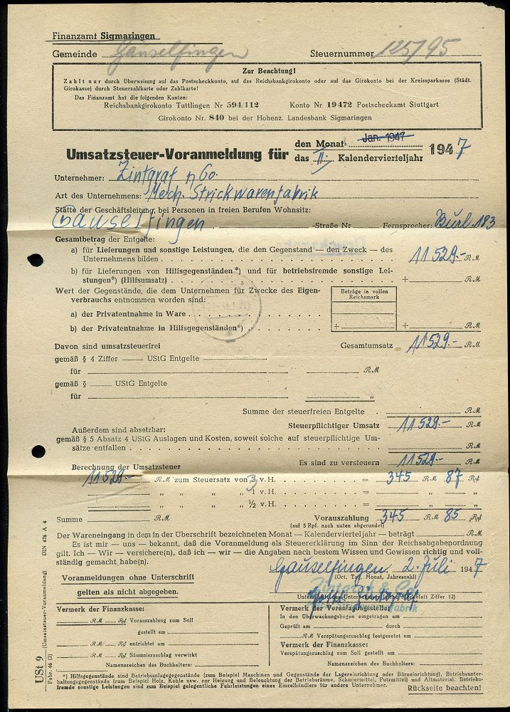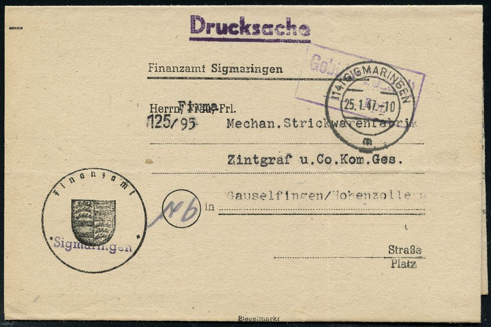 4795 | 14 € | POSTLEITRAUM 7400 (OHNE REUTLINGEN u. TÜBINGEN) : (14) SIGMARINGEN/ m 1947 (25.1.) 2K-Steg + viol. Ra.2: Gebühr bezahlt/___Rpf. + viol. 1K-HdN: Finanzamt (Wappen) Dienst-Falt-Bf. mit Inhalt: Umsatzsteuer-Voranmeldung 1947 | ![]() ![]() | |