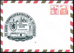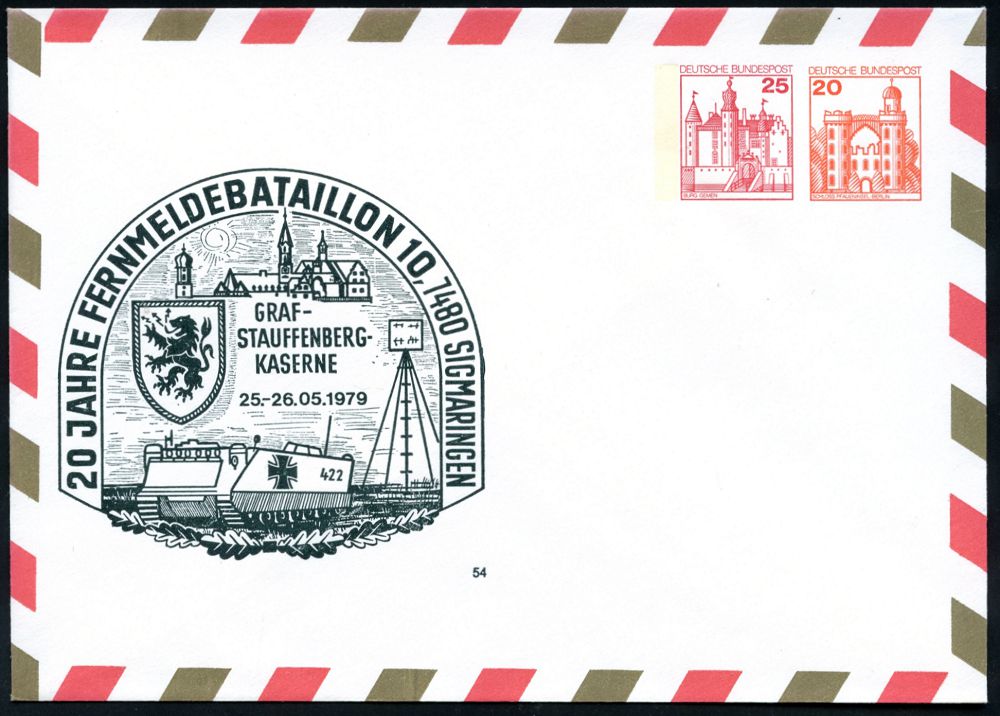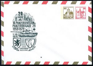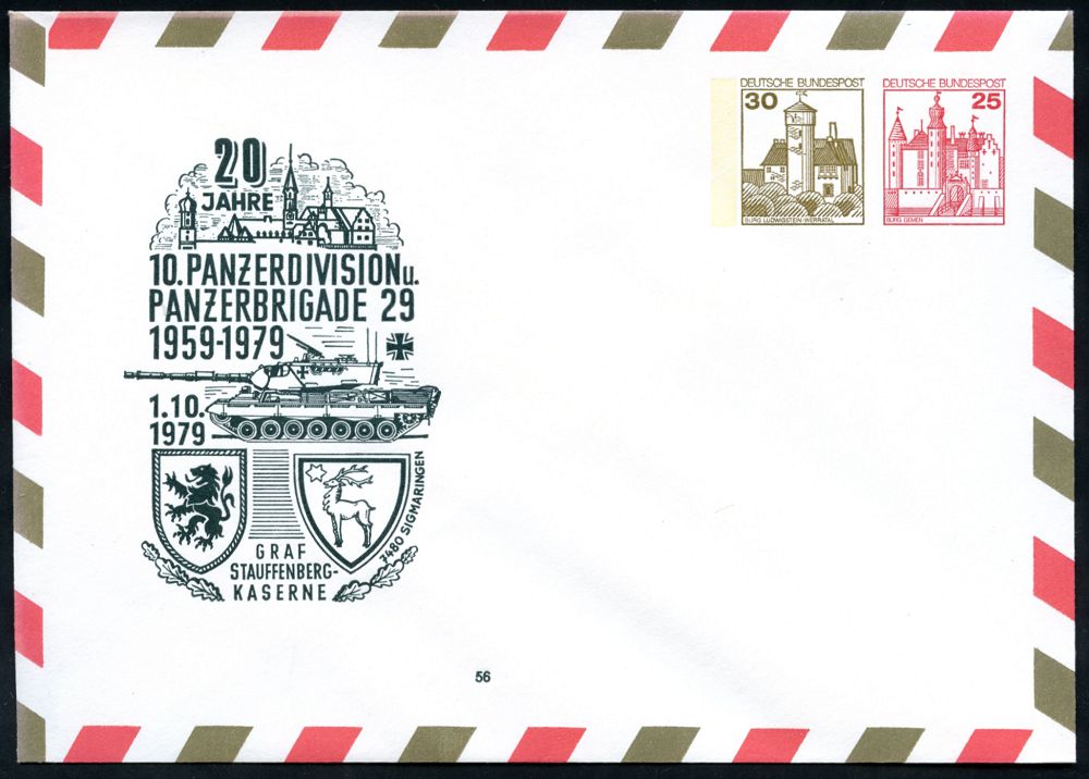 4802 | 10 € | POSTLEITRAUM 7400 (OHNE REUTLINGEN u. TÜBINGEN) : 7480 SIGMARINGEN 1979 (1.10.) PU 30 + 25 Pf. Burgen: 20 JAHRE 10. PANZERDIVISION u. PANZERBRIGADE 29.. = "Leopard 2" (u. Wappen etc.) ungebr. (Mi.PU 148) | ![]() | |