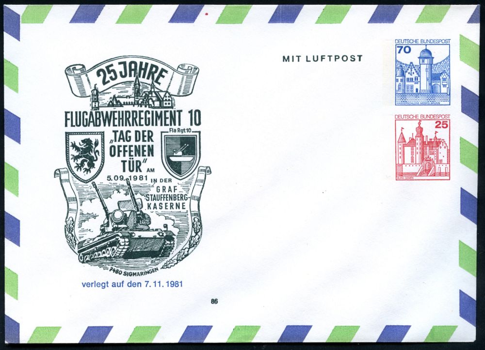 4803 | 10 € | POSTLEITRAUM 7400 (OHNE REUTLINGEN u. TÜBINGEN) : 7480 SIGMARINGEN 1981 (5.9.) PU 70 + 25 Pf. Burgen: 25 JAHRE FLUGABWEHRREGIMENT 10.. = Fla-Panzer "Gepard" (u. Wappen etc.) ungebr. (Mi.PU 226) | ![]() | |