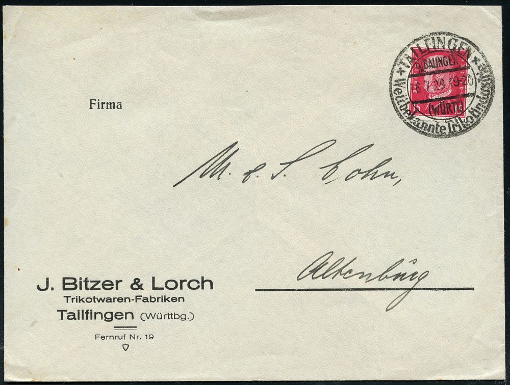 4807 | 15 € | POSTLEITRAUM 7400 (OHNE REUTLINGEN u. TÜBINGEN) : TAILFINGEN/ O.-A.BALINGEN/ (WÜRTT)/ Weltbekannte Trikotindustrie 1929 (6.7.) HWSt klar auf Firmenbf.: J. Bitzer & Lorch, Trikotwaren-Fabriken (Bo.2) | ![]() | |