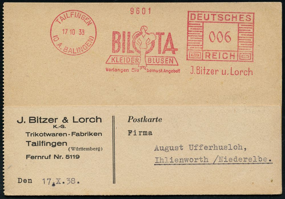 4816 | 18 € | POSTLEITRAUM 7400 (OHNE REUTLINGEN u. TÜBINGEN) : TAILFINGEN/ (O.A.BALINGEN)/ BILOTA/ KLEIDER BLUSEN/ ..J.Bitzer u.Lorch 1938 (17.10.) AFS Francotyp "Mäanderrechteck" (Frauenmode-Modell) klar gest. Firmen-Fern-Kt. (Dü.E-2CEh) | ![]() | |