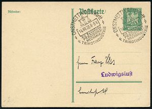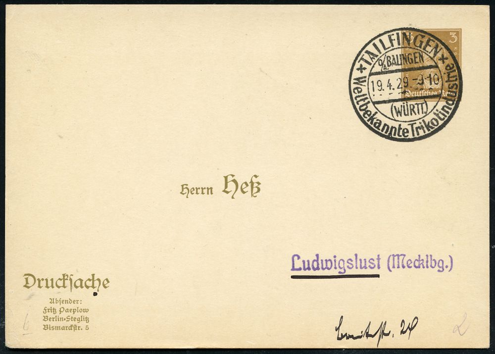 4808 | 18 € | POSTLEITRAUM 7400 (OHNE REUTLINGEN u. TÜBINGEN) : TAILFINGEN/ O.-A.BALINGEN/ (WÜRTT)/ Weltbekannte Trikotindustrie 1929 (19.2.) HWSt auf PP 3 Pf. Goethe, braun (Heß, Mi.PP 97/B 6-027) glasklar! (Bo.2) | ![]() | |