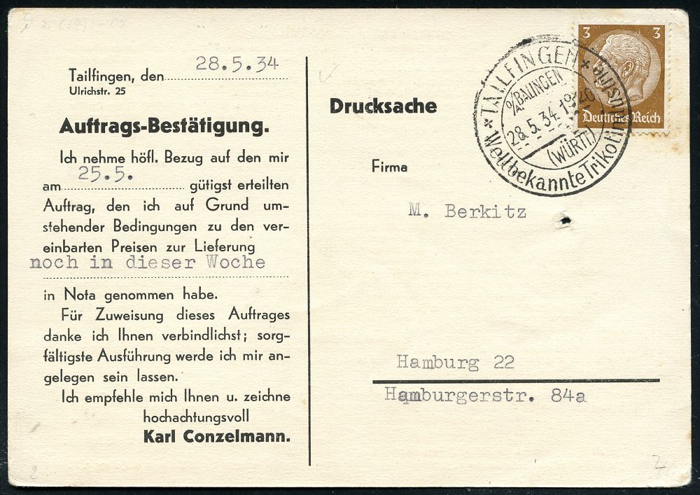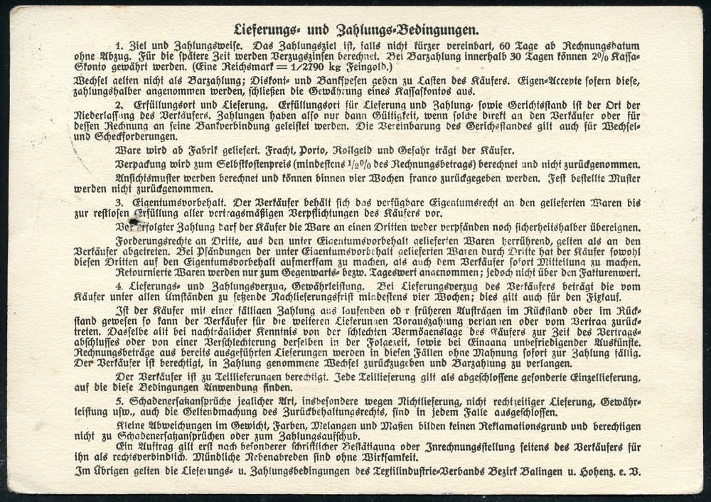 4810 | 16 € | POSTLEITRAUM 7400 (OHNE REUTLINGEN u. TÜBINGEN) : TAILFINGEN/ O.-A.BALINGEN/ (WÜRTT)/ Weltbekannte Trikotindustrie 1934 (28.5.) HWSt auf Firmen-Kt.: Karl Conzelmann = Lieferungs- u. Zahlungsbedingungen n. Hambg. (Bo.2) | ![]() ![]() | |