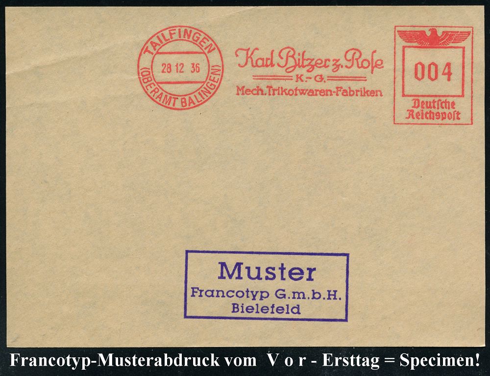 4811 | 35 € | POSTLEITRAUM 7400 (OHNE REUTLINGEN u. TÜBINGEN) : TAILFINGEN/ (OBERAMT BALINGEN)/ Karl Pitzer & Rose/ KG/ Mech.Trikotwaren-Fabrik 1936 (28.12.) AFS-Musterabdruck Francotyp "Reichsadler" , glasklar gest. Francotyp-Musterblatt vom V o r - Ersttag! (mit Attest), selten! (Dü.E-5CG) | ![]() ![]() | |