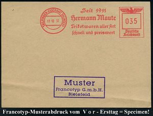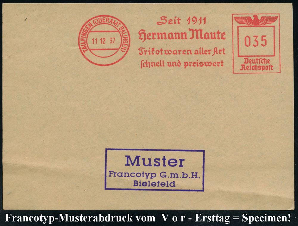 4812 | 35 € | POSTLEITRAUM 7400 (OHNE REUTLINGEN u. TÜBINGEN) : TAILFINGEN (OBERAMT TAILFINGER)/ Seit 1911/ Hermann Maute/ Trikotwaren.. 1937 (11.12.) AFS.Musterabdruck Francotyp "Reichsadler" , glasklar ges. Francotyp-Musterblatt vom V o r - Ersttag ! (mit Attest), selten! (Dü.E-5CGo) | ![]() ![]() | |
