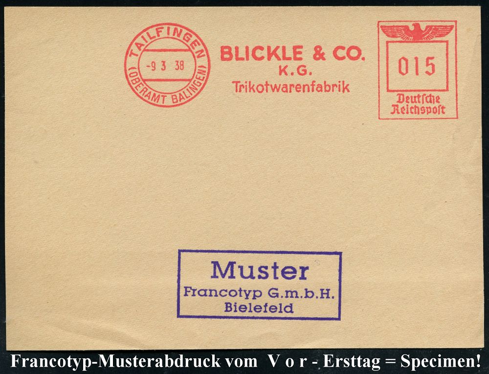 4813 | 35 € | POSTLEITRAUM 7400 (OHNE REUTLINGEN u. TÜBINGEN) : TAILFINGEN/ (OBERAMT TAILFINGEN)/ BLICKLE & CO./ K.G./ Trikotwarenfabrik 1938 (9.3.) AFS-Musterabdruck Francotyp "Reichsadler" , glasklar gest. Francotyp-Musterblatt vom V o r - Ersttag ! (mit Attest), selten! (Dü.E-5CGo) | ![]() ![]() | |