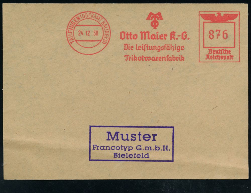 4817 | 35 € | POSTLEITRAUM 7400 (OHNE REUTLINGEN u. TÜBINGEN) : TAILFINGEN (OBERAMT BALINGEN)/ Otto Maier KG/ ..Trikotwarenfabrik 1938 (24.12.) AFS-Musterabdruck Francotyp "Reichsadler" (Firmen-Logo) glasklar gest. Francotyp-Musterblatt vom V o r - Ersttag ! (mit Attest), selten! (Dü.E-5CGo) | ![]() ![]() | |