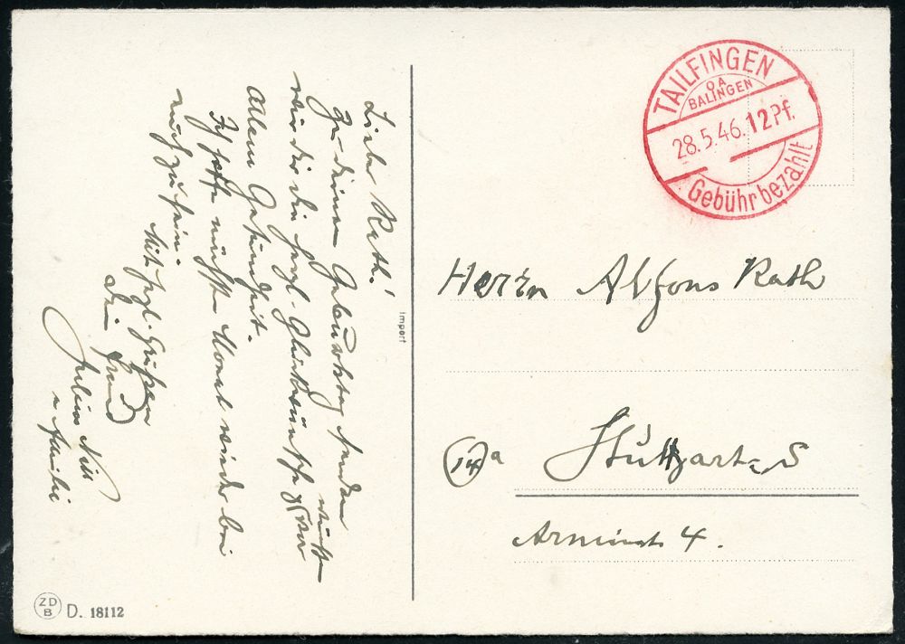 4818 | 15 € | POSTLEITRAUM 7400 (OHNE REUTLINGEN u. TÜBINGEN) : TAILFINGEN/ OA/ BALINGEN/ 12 Pf./ Gebühr bezahlt 1946 (28.5.) 1K-Brücken-PFS mit Wertangabe ohne Uhrzeit , klar gest. Künstler-Ak.: Fingerhut n. Stuttgart = Schalter-Freistempel mit Postkarten-Porto! (Dü.A-6, Nr.25) | ![]() ![]() | |