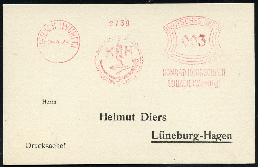 4822 | 18 € | POSTLEITRAUM 7400 (OHNE REUTLINGEN u. TÜBINGEN) : URBACH (WÜRTT)/ KH/ KONRAD HORNSCHUCH.. 1928 (4.4.) AFS Francotyp "Bogenrechteck" (Firmen-Logo mit Spindel u. Horn) Inl.-Drs.-Karte (Dü.E-1BAh) | ![]() | |