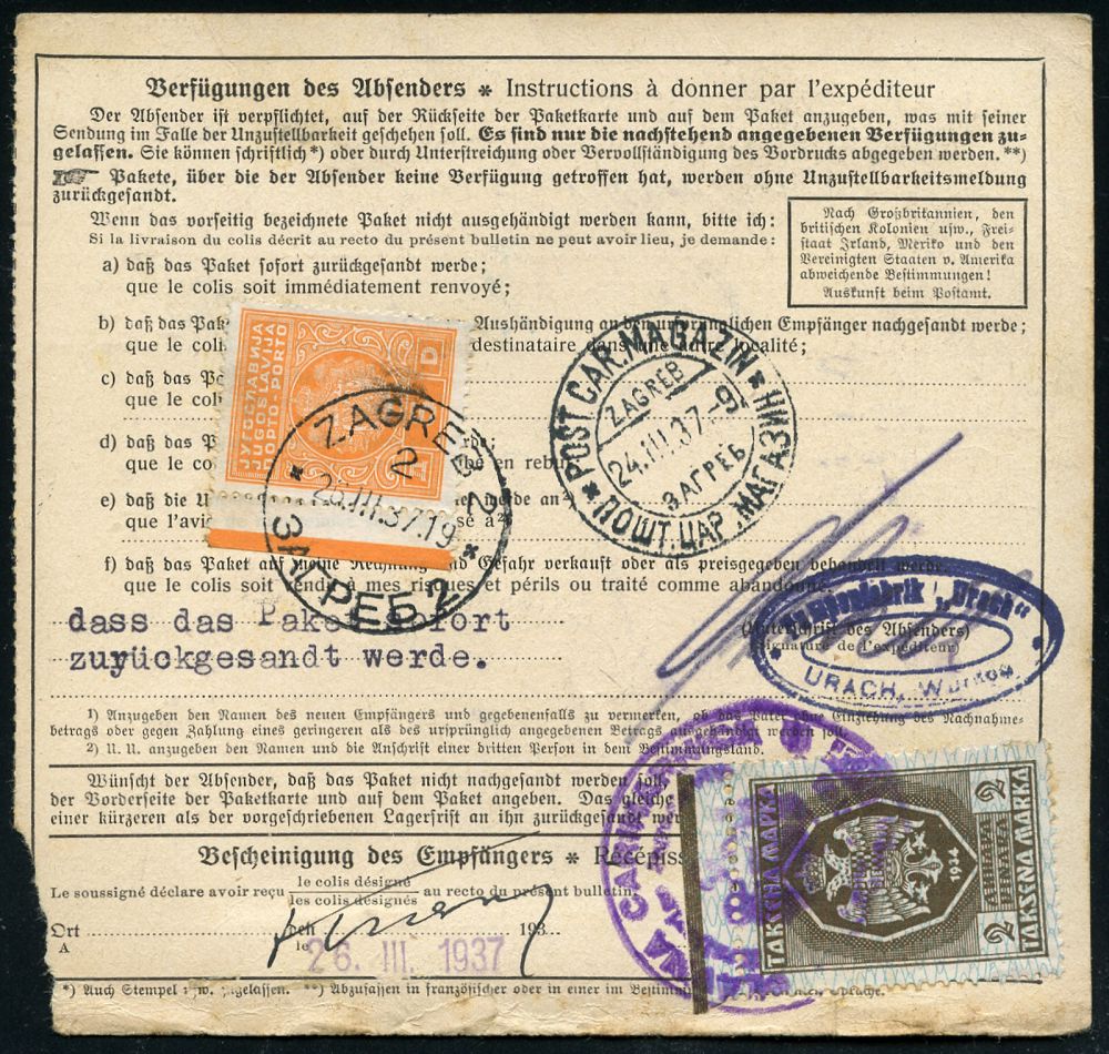 4823 | 22 € | POSTLEITRAUM 7400 (OHNE REUTLINGEN u. TÜBINGEN) : URACH (Württ.)/ **/ Gebühr bezahlt 1937 (19.3.) Doppeloval-PFS mit Uhrzeit + schw. Selbstbucher-Paketzettel: Urach (Württ.)/ Pumpenfabrik Urach + TS München 3, Ausl.-Selbstbucher-Paket-Kt. (links Eckfehler) n. Zagreb, rs. jugoslaw. Tax- u. Fiskalmarken (Dü.A-5, Nr.20) | ![]() ![]() | |