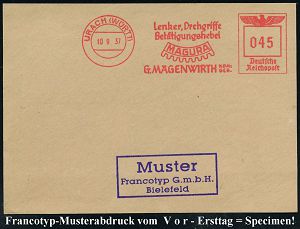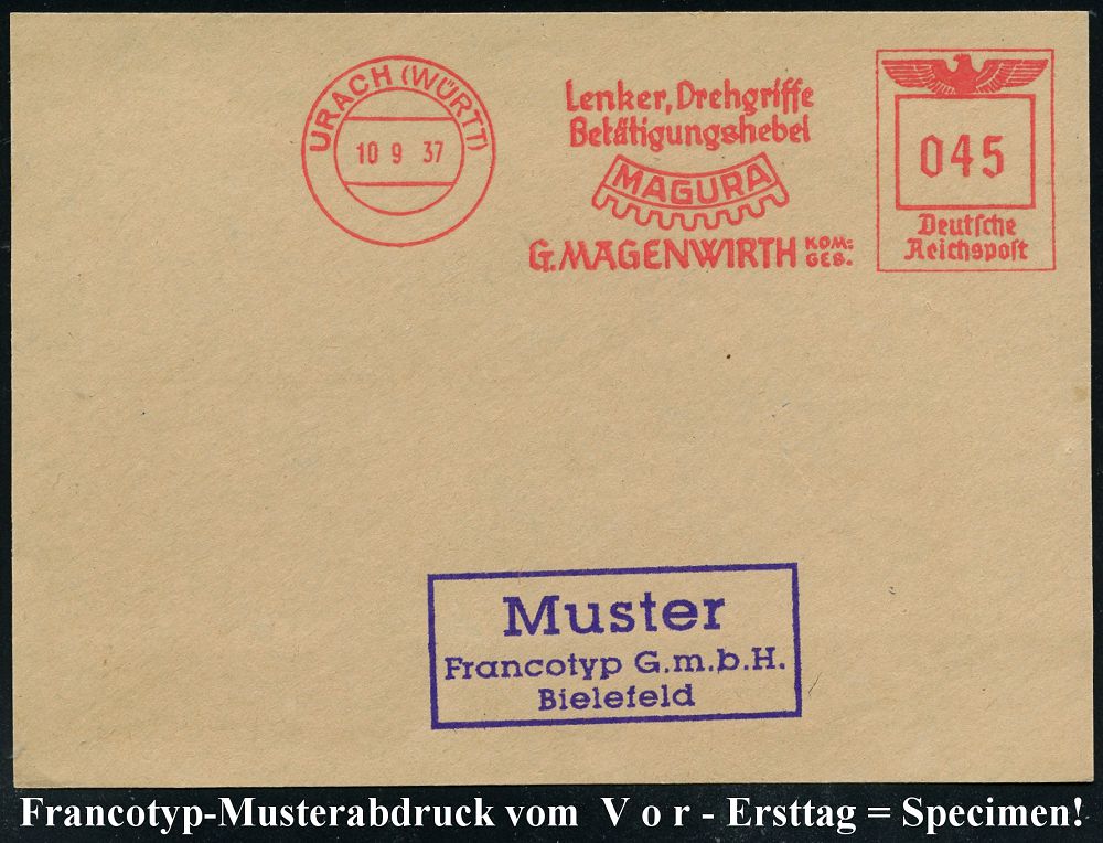 4824 | 35 € | POSTLEITRAUM 7400 (OHNE REUTLINGEN u. TÜBINGEN) : URACH (WÜRTT)/ Lenker.Drehgriffe/ Betätigungshebel/ MAGURA/ G.MAGENWIRTH.. 1937 (18.9.) AFS-Musterabdruck Francotyp "Reichsadler" (Zahnrad-Logo) glasklar gest. Francotyp-Musterblatt vom V o r - Ersttag ! (mit Attest), selten! (Dü.E-5CGo) | ![]() ![]() | |