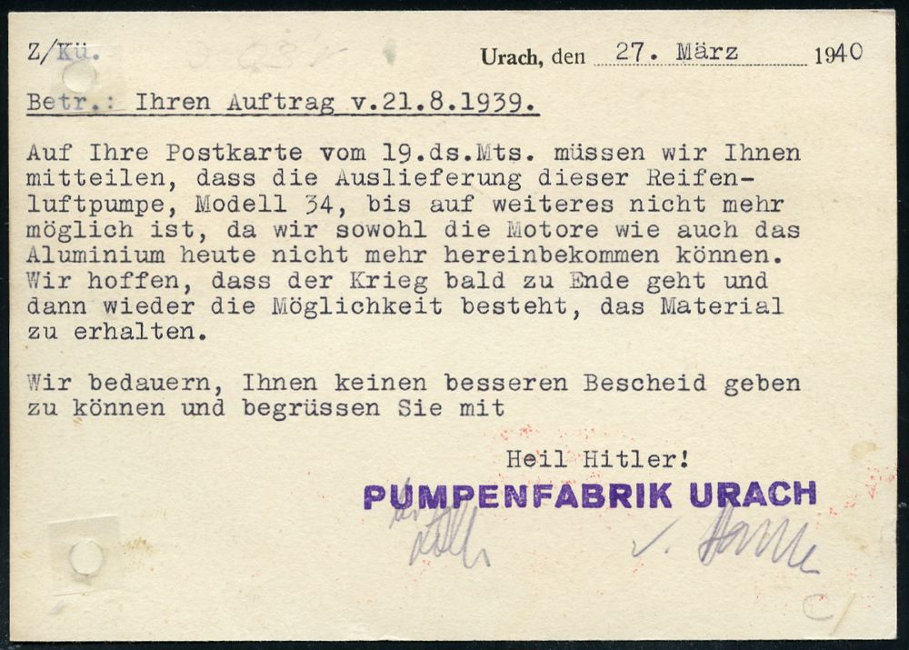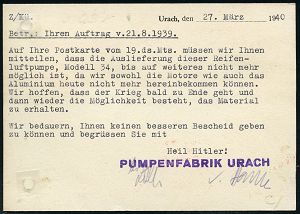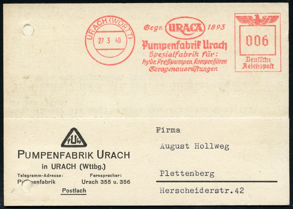 4825 | 18 € | POSTLEITRAUM 7400 (OHNE REUTLINGEN u. TÜBINGEN) : URACH (WÜRTT)..URACA/ PUMPENFABRIK URACH/ ..Hydr.Preßpumpen,Kompressoren/ Garagenausrüstungen 1940 (27.3.) AFS Francotyp "Reichsadler" (Firmen-Logo) Firmen-Kt.: PUMPENFABRIK URACH.. (links Reg.-Lochung geschl.) mit interessantem Text über Lieferprobleme wg. des Krieges n. Plettenberg (Dü.E-5CGo) | ![]() ![]() | |