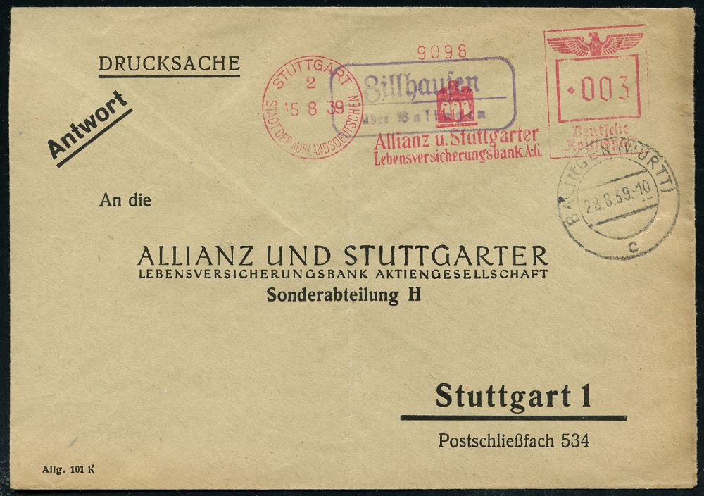 4828 | 20 € | POSTLEITRAUM 7400 (OHNE REUTLINGEN u. TÜBINGEN) : Zillhausen/ über Balingen 1939 (15.8.) viol. Ra.2 = PSt.II als Aufgabestempel auf vorausfrankiertem Rückantwort-Bf. + 2K-Steg: BALINGEN (WÜRTT)/c , vorschriftsmäßige Vorausfrankierung: STUTTGART/2SDA/ Allianz u. Stuttgarter/ Lebensversicherungsbank AG (003 Pf. für Drucksache) n. Stuttgart 1 (Dü.E-5DGh) | ![]() | |