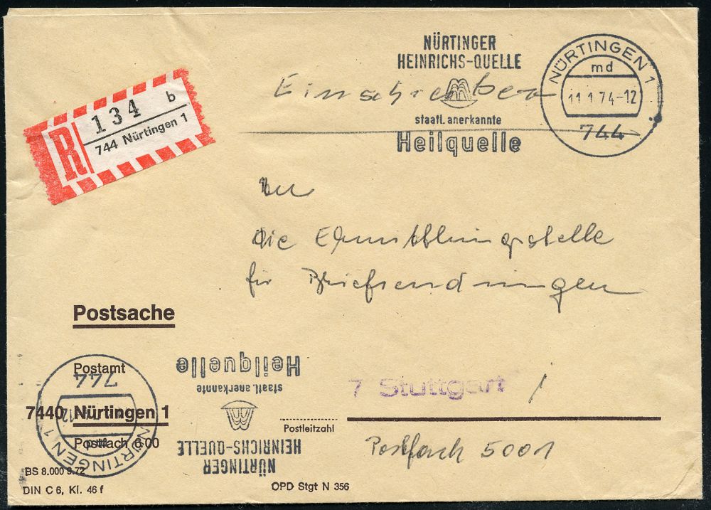 4720 | 15 € | POSTLEITRAUM 7400 (OHNE REUTLINGEN u. TÜBINGEN) : 744 NÜRTINGEN 1/ md/ ..HEINRICHS-QUELLE.. 1974 (11.1.) MWSt (Brunnen) 2x + RZ: 744 Nürtingen 1/b auf Postdienst-Bf.: Postamt 7440 Nürtingen 1 (Ortsdruck), Fern-R-Bf. (Bo.9 A II) | ![]() | |