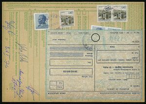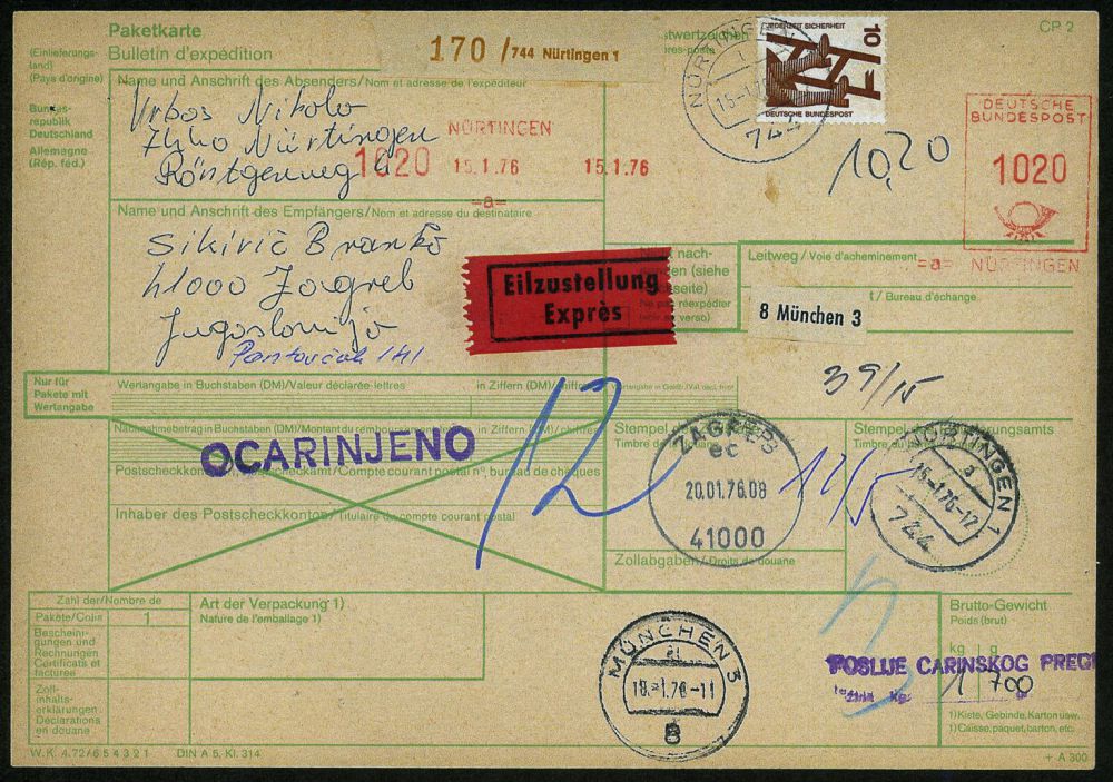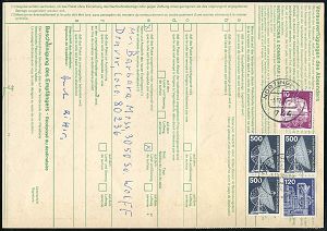 4721 | 18 € | POSTLEITRAUM 7400 (OHNE REUTLINGEN u. TÜBINGEN) : = a = NÜRTINGEN 1976 (15.1.) Paket-FS Francotyp "Posthorn" 1020 (Pf.) + 10 Pf. Unfall (kl. Mäng.) u.a. rs. MiF + brauner Paketzettel: 744 Nürtingen 1 + 1K: 744 NÜRTINGEN 1/a, Ausl.-Eil-Paketkt. n. Zagreb. seltene Portostufe! (Dü.H-6 A = seltene Type!) | ![]() ![]() | |