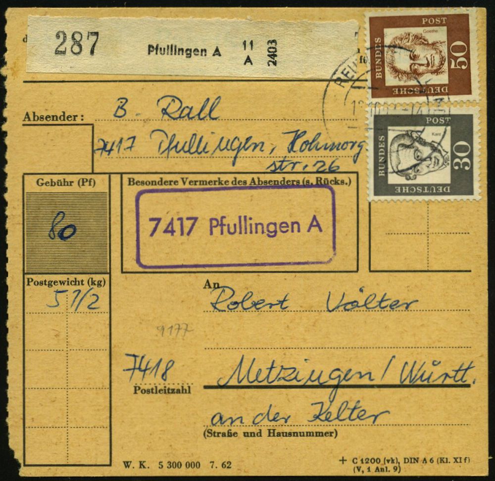 4739 | 15 € | POSTLEITRAUM 7400 (OHNE REUTLINGEN u. TÜBINGEN) : 7417 Pfullingen A 1962 (Okt.) viol. Ra = PSt.II + aptierter 2K-Steg: REUTLINGEN LAND/t = alte PLGZ entfernt (teils etw.undeutl.) satzreine Frankaur 30 Pf. Kant u. 50 Pf. Goethe, Inl.-Landpost-Paket-Kt. n. Metzingen (Mi.354, 356) | ![]() | |