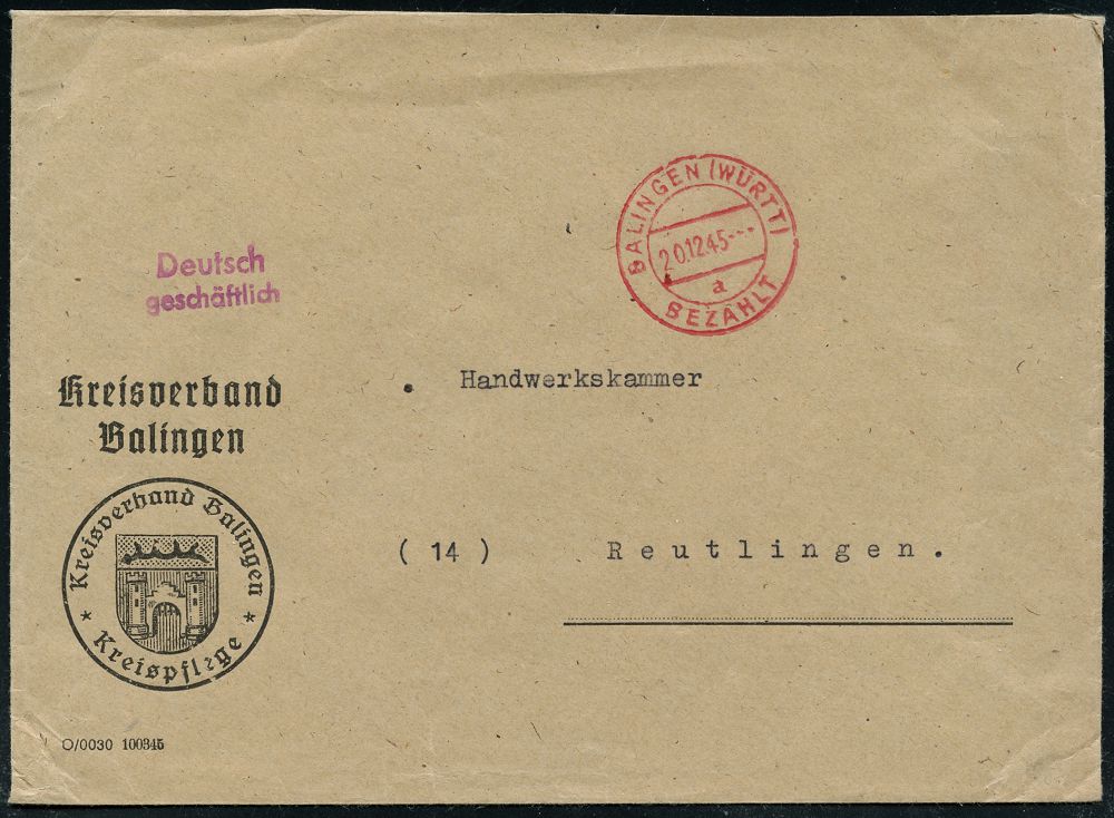 4604 | 12 € | POSTLEITRAUM 7400 (OHNE REUTLINGEN u. TÜBINGEN) : BALINGEN (WÜRTT)/ a/ BEZAHLT 1945 (20.12.) roter 2K-Steg-PFS ohne Uhrzeit u. Wertziffer , dekorativer, kommunaler Dienst-Bf.: Kreisverband.. Kreispflege (Dü.A-7, Nr.32 b) | ![]() | |