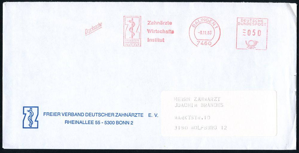 4610 | 10 € | POSTLEITRAUM 7400 (OHNE REUTLINGEN u. TÜBINGEN) : 7460 BALINGEN 1/ Zahnärzte/ Wirtschafts/ Institut 1984 (10.2.) AFS Pitney-Bowes "Posthorn" (Aeculapstab) , motivgl. Firmen-Bf. (Dü.E-26E) | ![]() | |