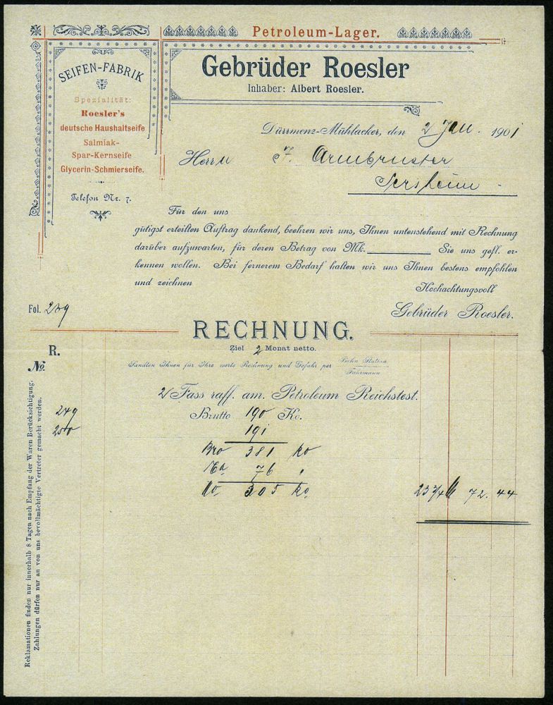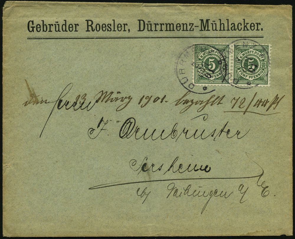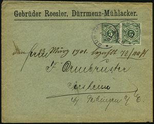 4618 | 25 € | POSTLEITRAUM 7400 (OHNE REUTLINGEN u. TÜBINGEN) : DÜRRMENZ 1899 (18.9.) 1K 2x auf Paar 5 Pf. Württbg. Ziffer, grün , Firmen-Bf.: Gebr. Roesler + Inhalt: dekorative Rechnung mit Zierrahmen (= Seifen-Fabrik) 2 Belege kompl.! (Mi.56 MeF) | ![]() ![]() | |