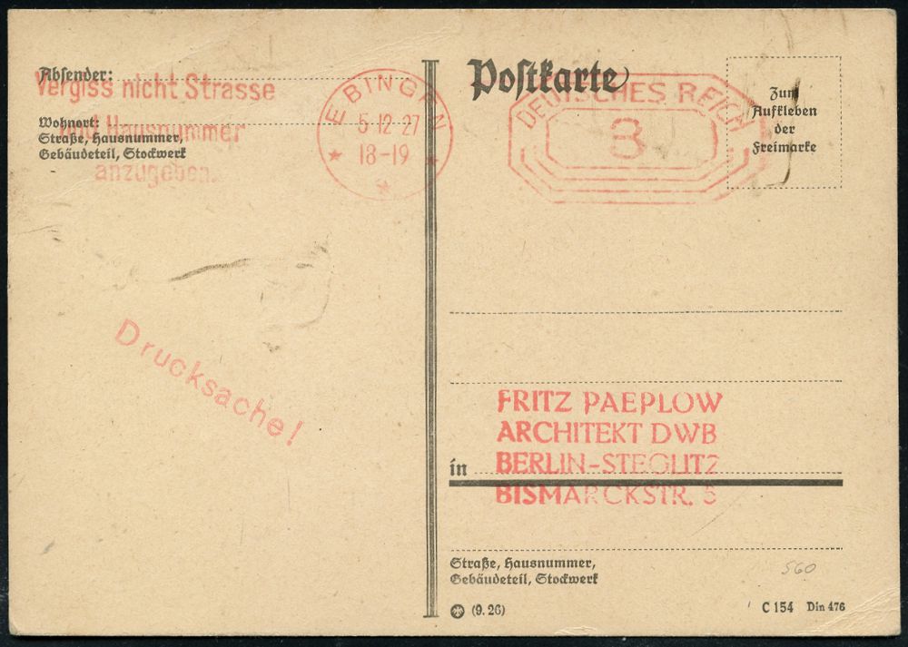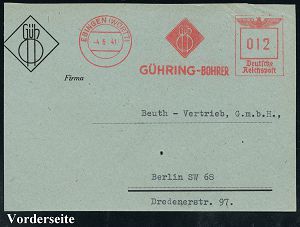 4632 | 14 € | POSTLEITRAUM 7400 (OHNE REUTLINGEN u. TÜBINGEN) : EBINGEN (WÜRTT)/ Güh/ GÜHRING-BOHRER 1941 (4.6.) AFS Francotyp "Reichsadler" (Firmen-Logo) motivgl. Firmen-Vorderseite, vergl. Kat.-Nr. 4633 (Dü.E-5CGo) | ![]() | |