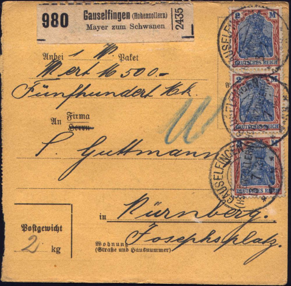 4641 | 20 € | POSTLEITRAUM 7400 (OHNE REUTLINGEN u. TÜBINGEN) : GAUSELFINGEN/ (HOHENZOLLERN)/ ** 1921 (13.7.) 1K-Segment 3x auf senkr. 3er-Streifen 2 M. Germania + Selbstbucher-Paketzettel: Gauselfingen (Hohenzollern)/Mayer zum Schwanen , Inl.-Selbstbucher-Paketkarte n. Nürnberg (Mi.153 MeF) | ![]() ![]() | |
