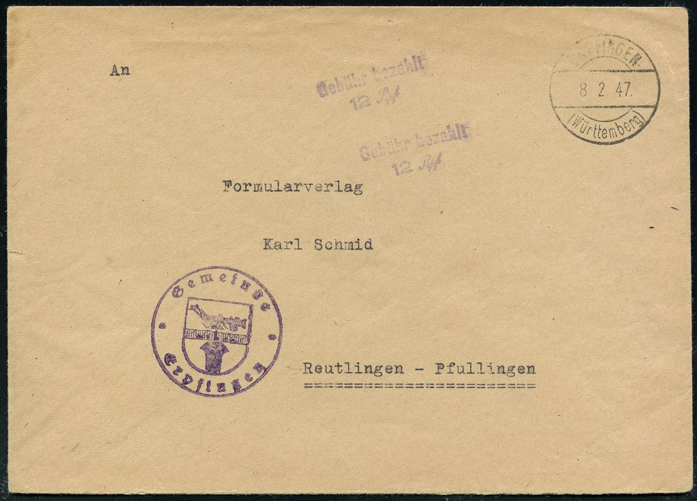 4639 | 14 € | POSTLEITRAUM 7400 (OHNE REUTLINGEN u. TÜBINGEN) : ERPFINGEN(Württemberg) 1947 (8.2.) 1K-Brücke + viol. 2L: Gebühr bezahlt/12 Rpf 2 x ! + viol. 1K-HdN: Gemeinde/ Erpfingen | ![]() | |