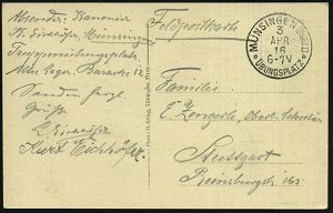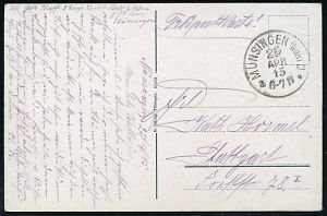 4683 | 12 € | POSTLEITRAUM 7400 (OHNE REUTLINGEN u. TÜBINGEN) : MÜNSINGEN (WÜRTT.)/ a* 1915 (25.4.) 1K + hs. Abs.: "..Landst.(urm) Batl. Ulm" auf Color-Feldpost-Ak.: Truppenübungsplatz Münsingen (2 Ansichten mit Truppenparade u. 2 Wappen) n. Stuttgart (Verlag H. Sting, Tübingen) | ![]() ![]() | |