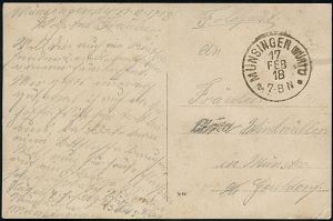 4701 | 14 € | POSTLEITRAUM 7400 (OHNE REUTLINGEN u. TÜBINGEN) : MÜNSINGEN (WÜRTT.)/ a * 1918 (17.2.) 1K klar auf individueller s/w.-Feldpost-Foto-Ak. Nr. 5826: Infanterieeinheit mit 2 sMG-Wagen n. Münster (ohne Uhv.) | ![]() ![]() | |