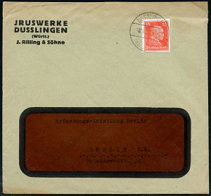 4619 | 16 € | POSTLEITRAUM 7400 (OHNE REUTLINGEN u. TÜBINGEN) : DUSSLINGEN/ (Württemberg) 1927 (1.9.) 1K-Brücke auf EF 15 Pf. Kant mit Firmenlochung "J R" = J. R illing auf Firmen-Bf.: JRUSWERKE DUSSLINGEN.. J. Rilling & Söhn (Mi.391 EF, Perfin) | ![]() | |