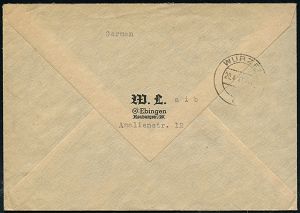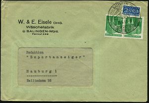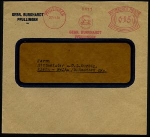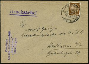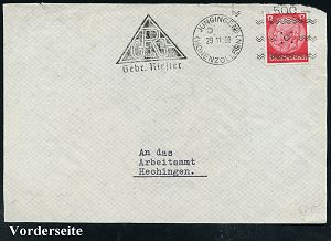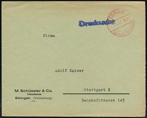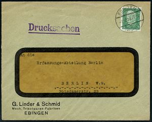4622 | 15 € | POSTLEITRAUM 7400 (OHNE REUTLINGEN u. TÜBINGEN) : EBINGEN/ e/ (Württ.) 1929 (2.10.) 1K-Brücke EF 5 Pf. Hindenbg. , blau mit Firmen-Lochung: "L & S" , klar gest. Firmen-Bf.: G. Linder & Schmid, Mech. Trikotwaren-Fabriken.. (Mi.454 EF, Perfin) | ![]() | |