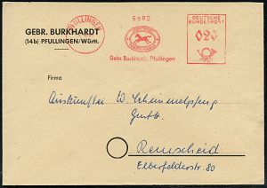 4738 | 15 € | POSTLEITRAUM 7400 (OHNE REUTLINGEN u. TÜBINGEN) : PFULLINGEN/ ..Gebr.Burkhardt 1957 (2.8.) AFS Francotyp "Posthorn" mit alter Zähl-Nr. = Spätverwendung (Pferd), k lar gest. Firmen-Bf. (Dü.E-23BAh ohne PLGZ, alte Zählnr.) | ![]() | |