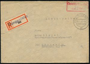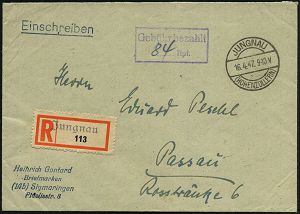 4653 | 16 € | POSTLEITRAUM 7400 (OHNE REUTLINGEN u. TÜBINGEN) : JUNGNAU/ (HOHENZOLLERN) 1947 (16.4.) 1K-Brücke + viol. Ra.2: Gebühr bezahlt/... RPf. + hs. "84" (Pf.) + provis. RZ: Jungnau (viol. 1L aus Blanco-RZ) klar gest. Firmen-R-Bf. n. Passau | ![]() | |
