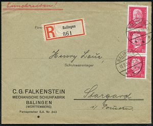 4601 | 18 € | POSTLEITRAUM 7400 (OHNE REUTLINGEN u. TÜBINGEN) : BALINGEN/ *** 1930 (17.2.) 1K-Brücke 2x auf 3x 15 Pf. Hindenbg., + RZ: Balingen, Firmen-Fern-R-Bf.: C. G. FALKENSTEIN, MECHANISCHE SCHUHFABRIK.. n. Stargard (Mi.414 MeF) | ![]() | |