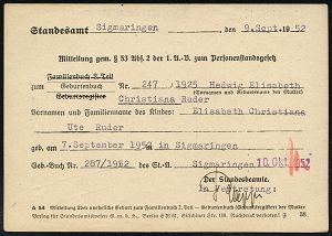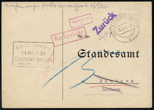 4607 | 18 € | POSTLEITRAUM 7400 (OHNE REUTLINGEN u. TÜBINGEN) : (14b) BALINGEN (WÜRTT)/ g 1952 (18.9.) 2K-Steg auf unfrankierter Standesamts-Dienstkt. an Standesamt Bautzen, viol. 1K: Zurück + 2 verschied. Ra.: Nachgebühr ("15" Pf.), Eingangs-Ra.: STANDESAMT BAUTZEN, hs.Vermerk: "Annahme wegen Porto verweigert", Dokument des "Kalten Krieges"! | ![]() ![]() | |