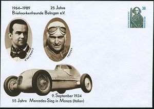 4611 | 8 € | POSTLEITRAUM 7400 (OHNE REUTLINGEN u. TÜBINGEN) : Balingen 1989 PU 38 Pf. Roland: 55 Jahre Mercedes-Sieg, Monza 9. Sept. 1934, CARACIOLA FAGIOLI (Rennfahrer-Portraits, Auto) ungebr. | ![]() | |