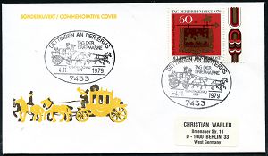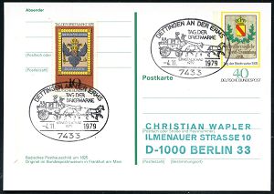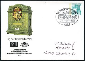 4617 | 10 € | POSTLEITRAUM 7400 (OHNE REUTLINGEN u. TÜBINGEN) : 7433 DETTINGEN AN DER ERMS/ TAG DER/ BRIEFMARKE 1979 SSt auf PU 40 Pf. Tag der Briefmarke (Briefkasten von 1877) Inl.-Bf (Mi. PU 110/60) | ![]() | |