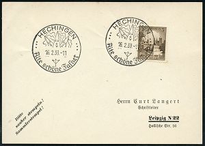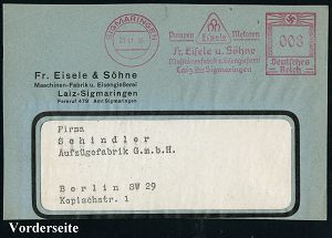 4793 | 14 € | POSTLEITRAUM 7400 (OHNE REUTLINGEN u. TÜBINGEN) : SIGMARINGEN/ Pumpen/ Eisele/ Motoren/ Fr.Eisele u.Söhne/ ..Eisengießerei.. 1936 (21.11.) AFS Francotyp "Hakenkreuz" (Firmen-Logo) kleine Bedarfs-Vorderseite (Dü.E-3CEo) | ![]() | |